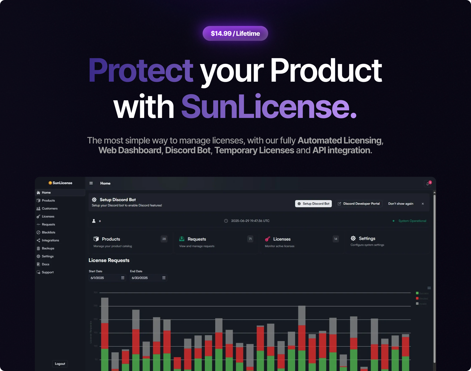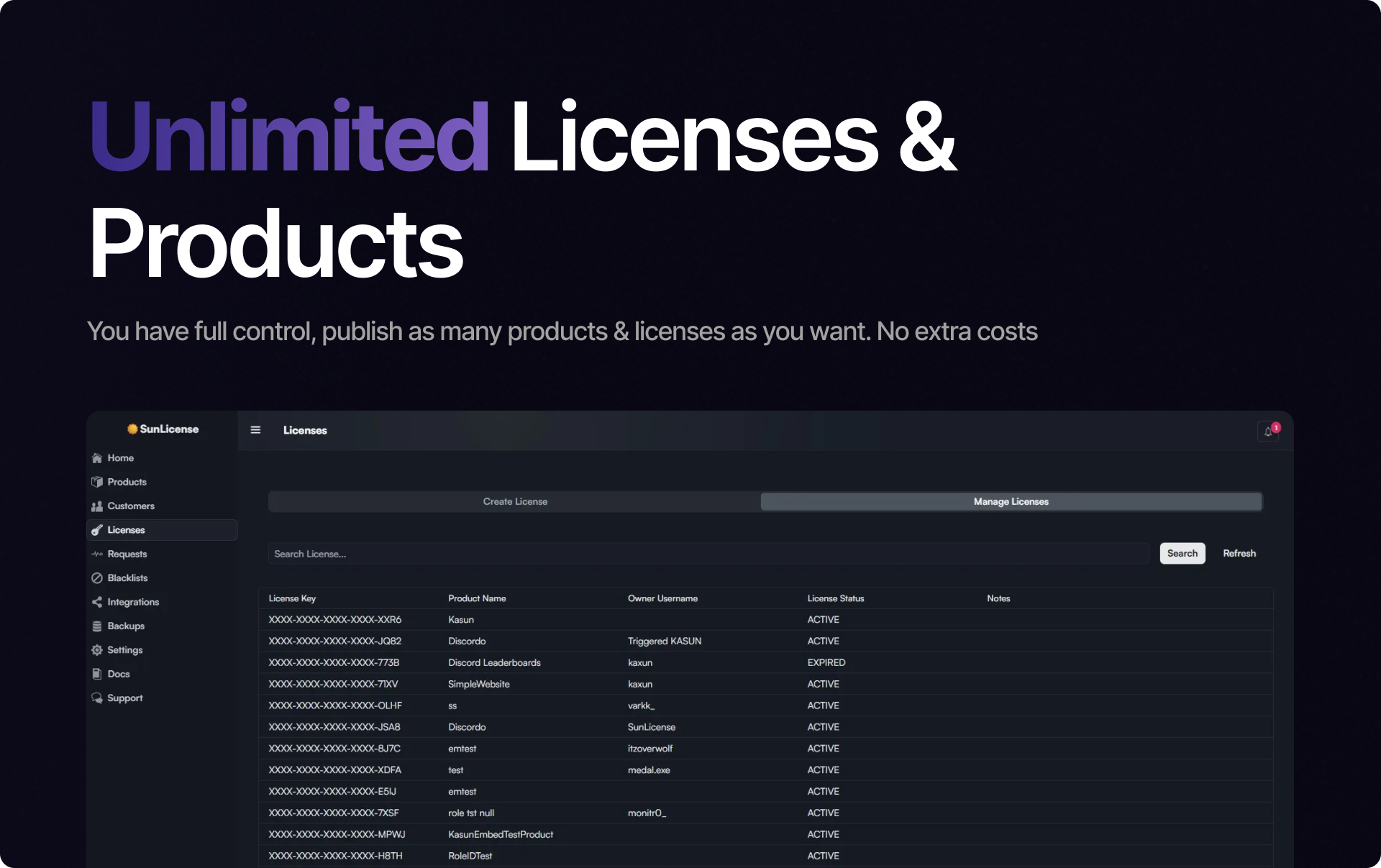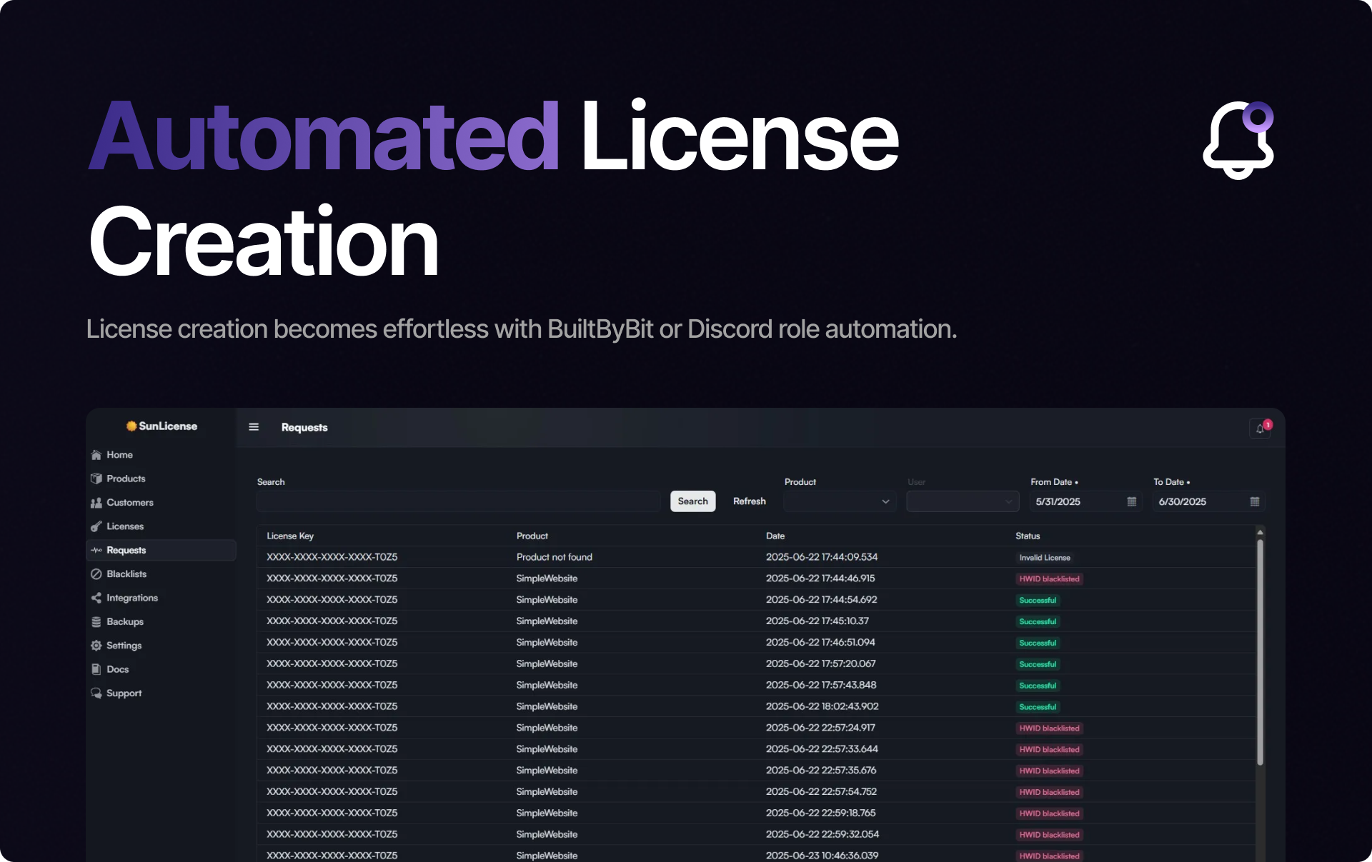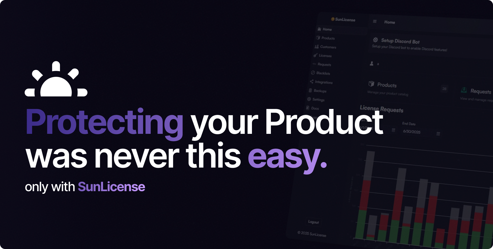 Effortlessly manage licenses, track usage, and secure your software with SunLicense. This all-in-one system allows you to create, validate, and control license keys while keeping your product safe and easy to manage.​