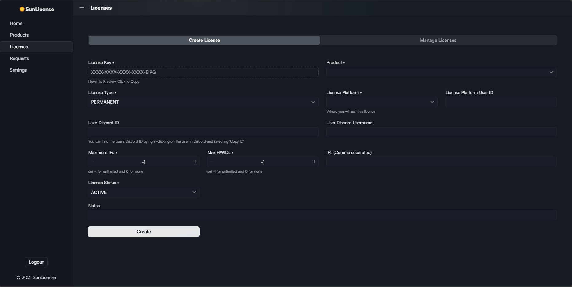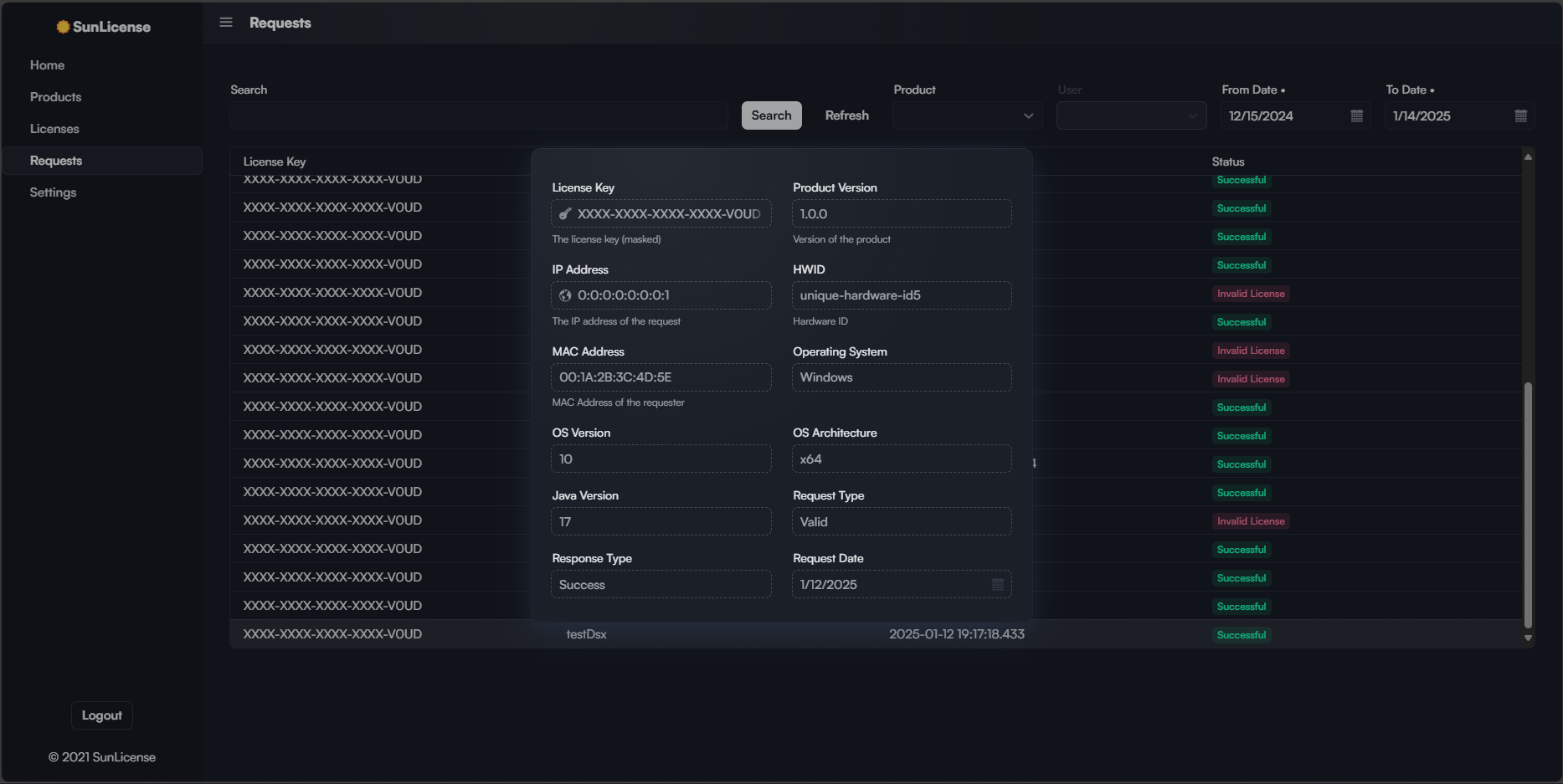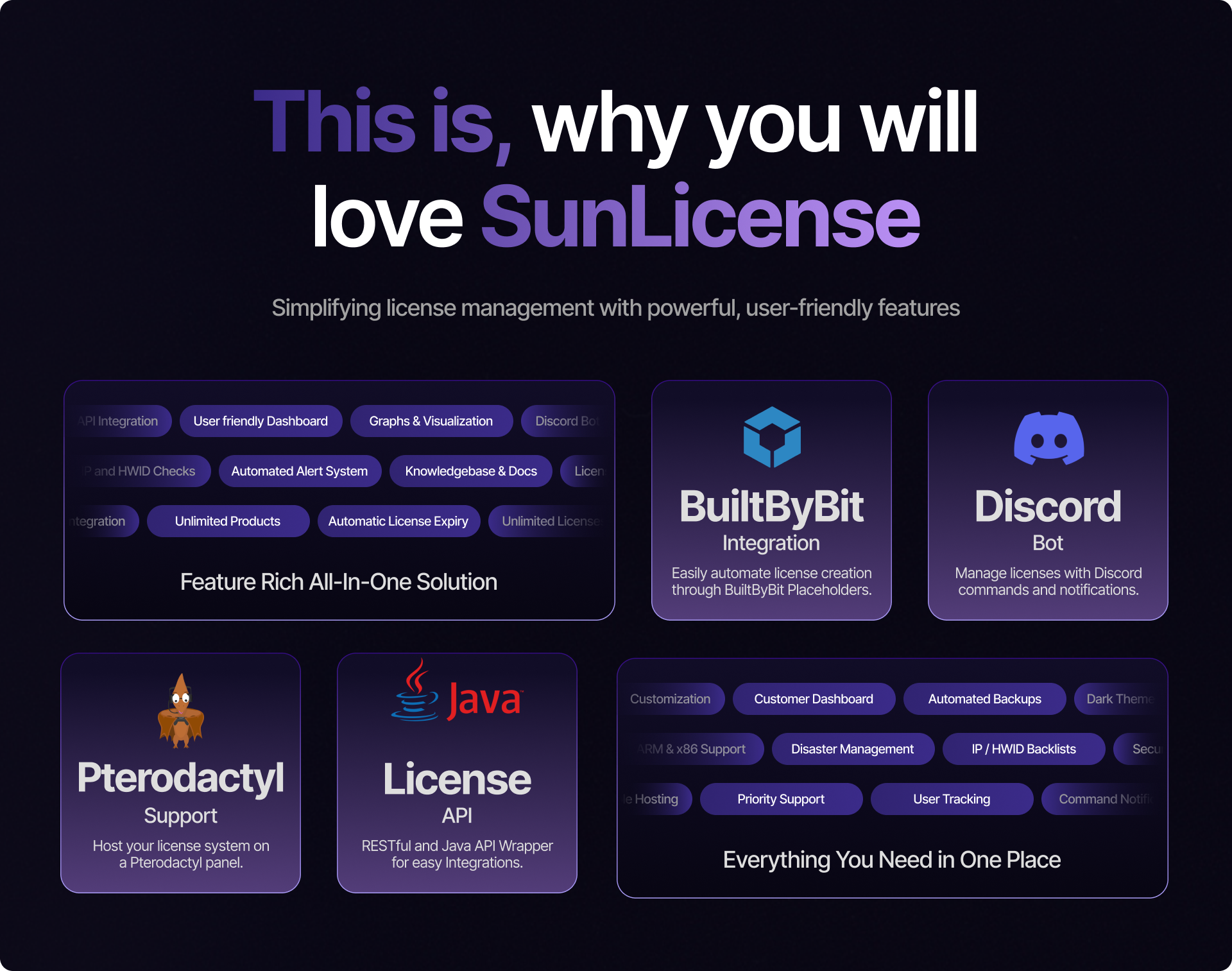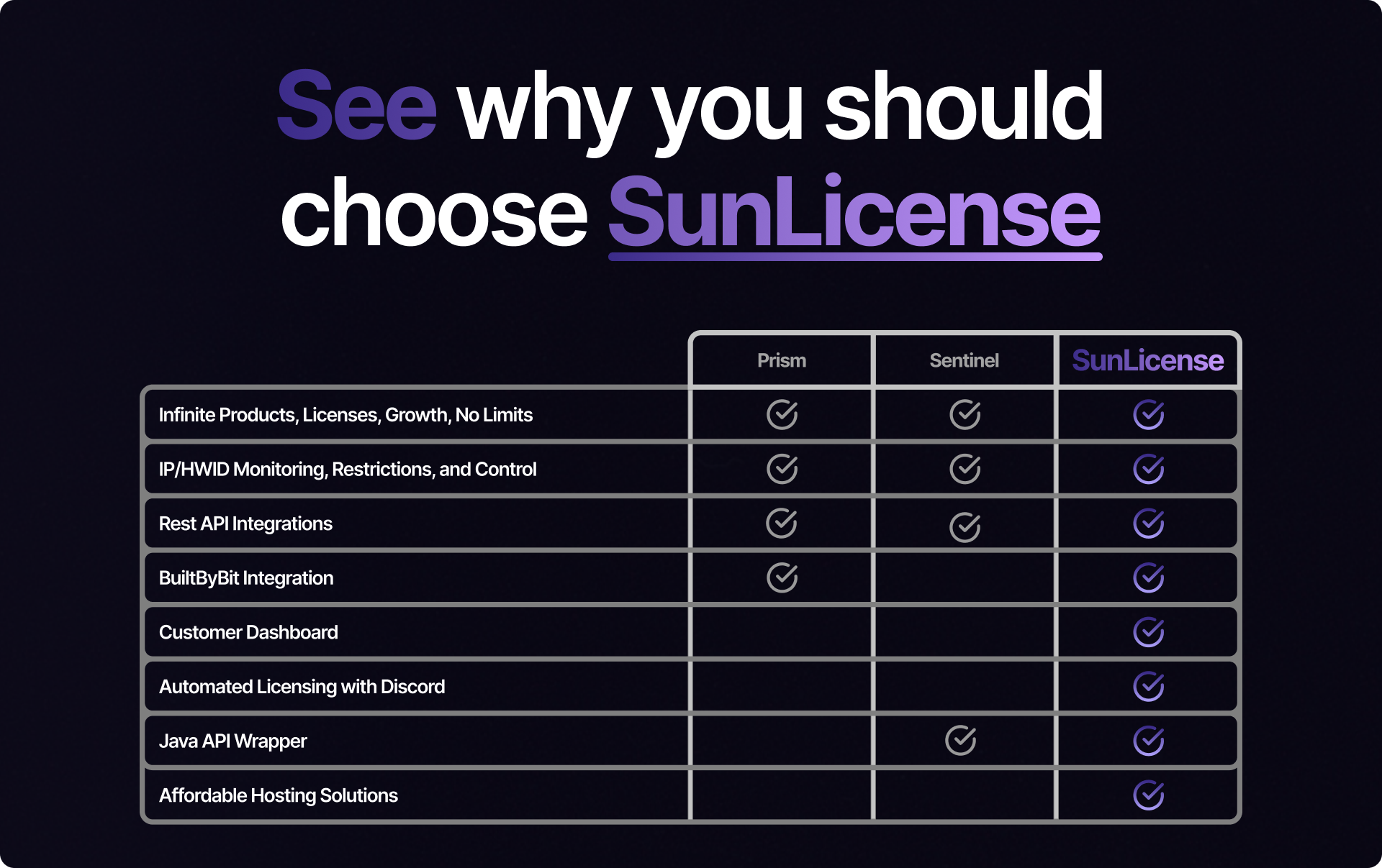Effortlessly manage licenses, track usage, and secure your software with SunLicense. This all-in-one system allows you to create, validate, and control license keys while keeping your product safe and easy to manage.​